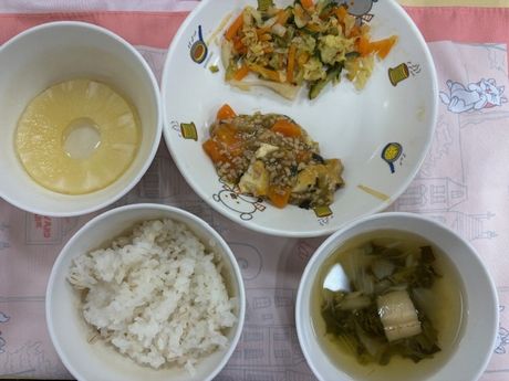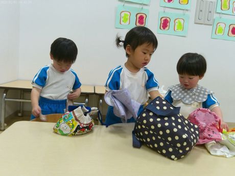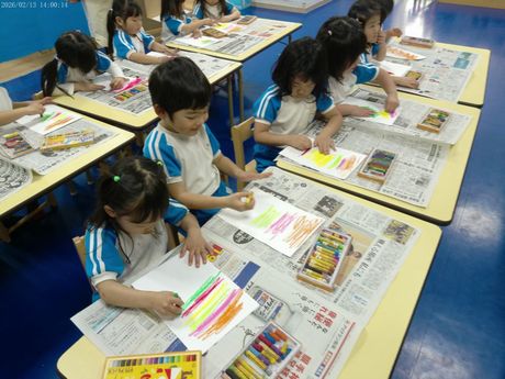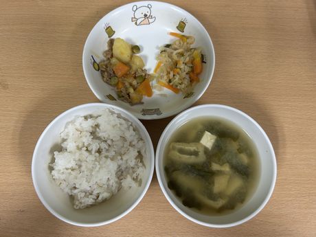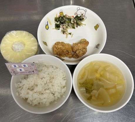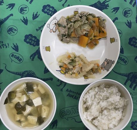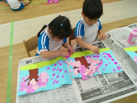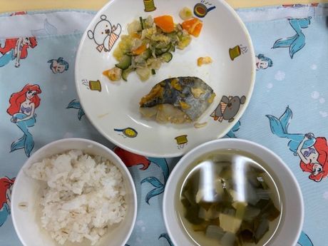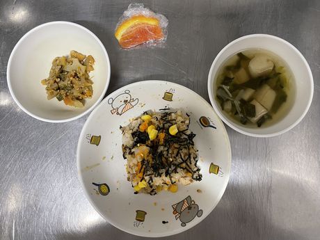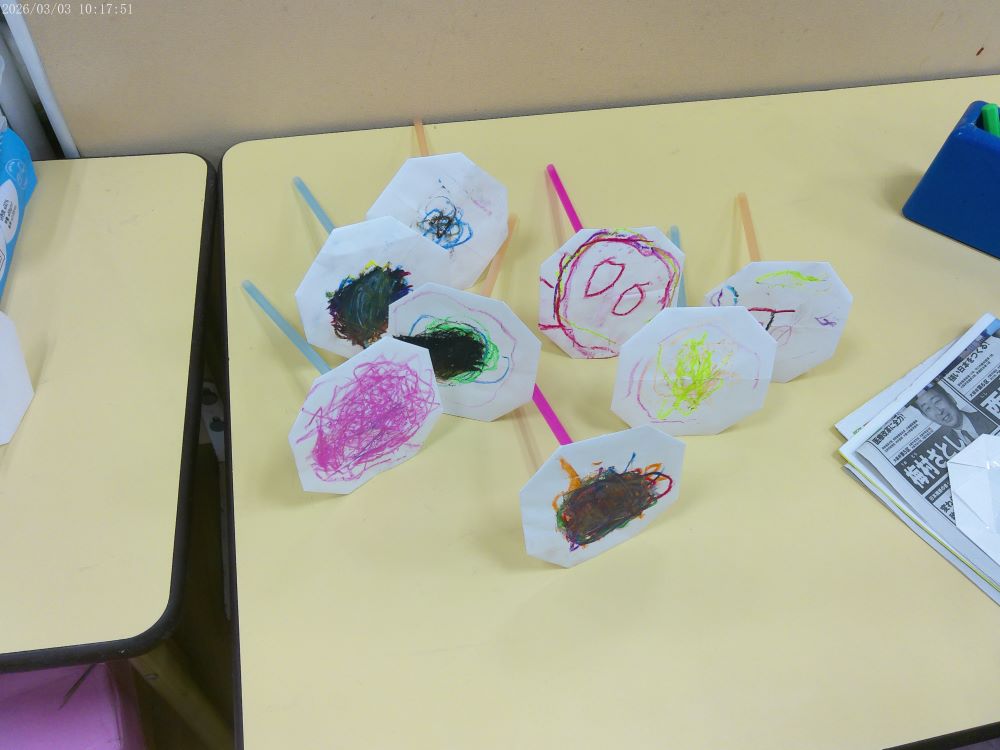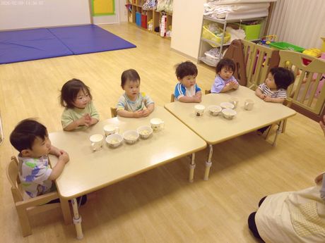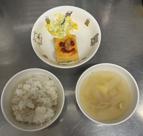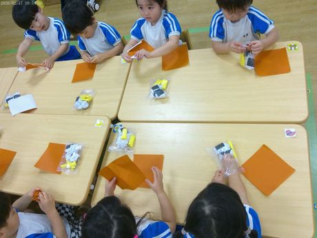 3月10日(火) 本日の給食 (写真は3歳児クラス) 麦ごはん、肉じゃが、切り干大根の甘酢和え、味噌汁 おやつ : 牛乳、アメリカンドッグ風パン 3月9日(月) 本日の給食 (写真は2歳児クラス) きつねうどん、小松菜のしらすサラダ、果物(パイン) おやつ : 牛乳、塩昆布おにぎり 2026年3月9日(月) 0歳児 つくし組 今日は食育で手や足を使ってコンフレークをつぶしました。はじめは何をするんだろう?と不思議そうな表情でしたが、給食の先生にお手本を見せてもらうと嬉しそうに張り切って参加できていました。おやつのマシュマロおこしになるのが楽しみです。(3/6)(当日の食育のようすはホームページ「園児のようす」動画で紹介しています) 3月6日(金) 本日の給食 (写真は4.5歳児クラス) ぎょうざ丼、野菜のゆかり合え、中華スープ、果物(バナナ) おやつ : 牛乳、マシュマロおこし 3月5日(木) 本日の給食 (写真は4.5歳児クラス) 麦ごはん、具だくさんしょうが焼き、大根サラダ、みそ汁 おやつ : 牛乳、豆腐のブラウニー 3月4日(水) 本日の給食 (写真は3歳児クラス) 麦ごはん、さけの塩焼き、キャベツのごまじゃこサラダ、すまし汁 おやつ : 牛乳、ツナマヨパン 2026年3月4日(水) 2歳児 ちゅうりっぷ組 紙トンボを作りました。絵をかいて、飛ばして遊びました。飛ばし方も上手になりました。。(3/3) 3月3日(火) 本日の給食 (写真は4.5歳児クラス) ちらし寿司、れんこんの炒め煮、野菜スープ、果物(オレンジ) おやつ : 牛乳、ひし餅ケーキ 2026年3月3日(火) 1歳児 たんぽぽ組 人で給食の準備もできるよいうになってきて、一生懸命頑張っているたんぽぽ組の子どもたちです。 3月2日(月) 本日の給食 (写真は3歳児クラス) 麦ごはん、厚揚げのそぼろあんかけ、野菜の塩昆布和え、すまし汁、果物(パイン) おやつ : 牛乳、マカロニのきな粉和え 2026年3月2日(月) 0歳児 つくし組 ひと足早くお雛祭り遊びをしました。ひしもちと同じ色のブロックをみんなで高く積んだり、それを壊したり、色んな所に運んだり・・・楽しく体を動かすことができました。(2/25) 2月28日(土) 本日の給食 (写真は4歳児クラス) ちらし寿司、油揚げと株の炒め煮、すまし汁、果物(バナナ) おやつ : 牛乳、たまごドッグ 2月27日(金) 本日の給食 (写真は3歳児クラス) 麦ごはん、ひき肉のオムレツ、キャベツとコーンのサラダ、野菜スープ おやつ : 牛乳、ちゅうりっぷ組手作りクッキー 2026年2月27日(金) 5歳児 ほし・そら組 今日は折り紙でわっかひこうきを作りました。力加減を調整しながらどうしたら飛ぶか考えながら楽しんでいた子どもたちです。(2/25) 2月26日(木) 本日の給食 (写真は2歳児クラス) 麦ごはん、中華風からあげ、もやしの中華風サラダ、中華スープ、果物(パイン) おやつ : 牛乳、マフィン 2026年2月26日(木) 3歳児 さくら組 今日は雨だったのでプリント活動をした後に、室内でマットを使って遊びました。久しぶりのマット遊びだったので、すごく楽しんでくれていました。(2/25) 2月25日(水) 本日の給食 (写真は4歳児クラス) 麦ごはん、魚の味噌マヨネーズ焼き、ツナサラダ、すまし汁 おやつ : 牛乳、マシュマロおこし 2026年2月25日(水) 2歳児 ちゅうりっぷ組 少し季節は早いですが、みんなで桜の花びらをスタンプしました。 2月24日(火) 本日の給食 (写真は3歳児クラス) 根菜カレー、ひじきのサラダ、果物(みかん) おやつ : 牛乳、ちまき風おにぎり 2026年2月24日(火) 1歳児 たんぽぽ組 外が暖かかったので、シティーウォークへお散歩しました。観光客の人に手を振ったり、お友だち同士でかくれんぼしたり走ったりと楽しんでいました。 2026年2月23日(月) 0歳児 つくし組 今日はひな祭り製作をしました。おひなさまとおだいりさまの服に綿棒を使ってお花柄の模様をつけました。(2/19) 2月20日(金) 本日の給食 (写真は1歳児クラス) ロールパン、バーベキューチキン、シーザーサラダ、野菜スープ、果物(パイン) おやつ : 牛乳、ごま味噌焼きおにぎり 2026年2月19日(木) 3歳児 さくら組 今日は今年度最後の室内壁面製作で、まずはクレパスで色塗りをしました。みんな大好きなクレパスを組み合わせて塗ったり、指で伸ばしたりして楽しんでいました。(2/13) 2月18日(水) 本日の給食 (写真は3歳児クラス) きつねうどん、野菜の塩昆布和え、くだもの(バナナ) おやつ : 牛乳、揚げパン 2026年2月18日(水) 2歳児 ちゅうりっぷ組 3月の玄関壁面製作で「おべんとうバス」を作りました。おにぎりを作り、のりを巻いて卵焼きを作ったりと楽しんでいました。(2/17) 2026年2月18日(水) 2歳児 ちゅうりっぷ組 みんなで少し早い桜を咲かせました。(2/12) 2月16日(月) 本日の給食 (写真は3歳児クラス) 麦ごはん、具沢山のしょうが焼き、野菜の磯和え、みそ汁 おやつ : 牛乳マカロニのきな粉和え 2026年2月13日(金) 5歳児 ほし・そら組 今日は3月の玄関壁面製作の背景をみんなで作りました。役割分担をしてみんな楽しそうに作っていました。(2/13) 2月12日(木) 本日の給食 (写真は5歳児クラス) 麦ごはん、厚揚げのそぼろあんかけ、大