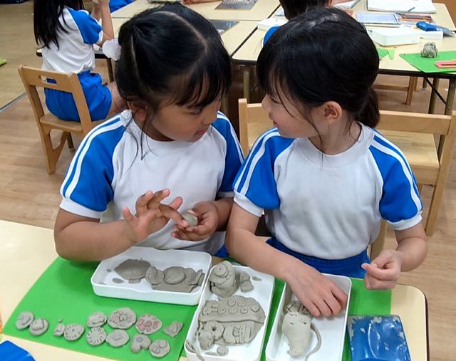 - ロールパン ハンバーグ 切干大根のさっぱりサラダ 野菜スープ 果物 / 牛乳 マシュマロおこし